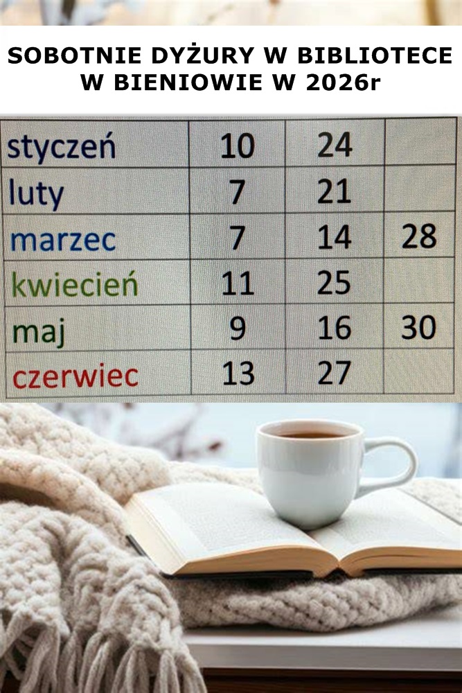 Lekcje biblioteczne 5 stycznia 20265 stycznia 2026 SOBOTNIE DYŻURY W BIBLIOTECE W BIENIOWIE 2026 Posted By: Katarzyna Zychla 0 Comment Serdecznie zapraszamy <3