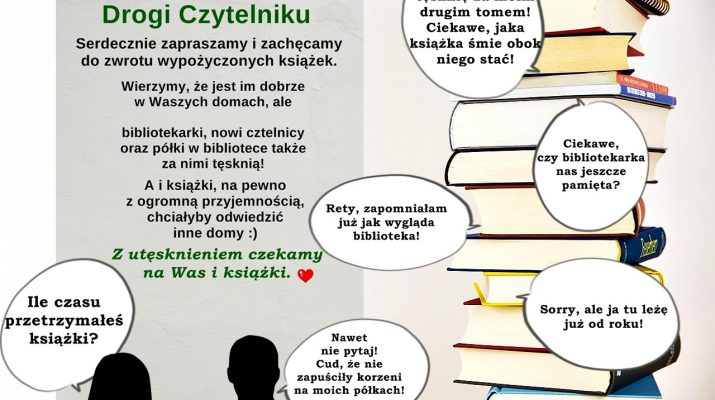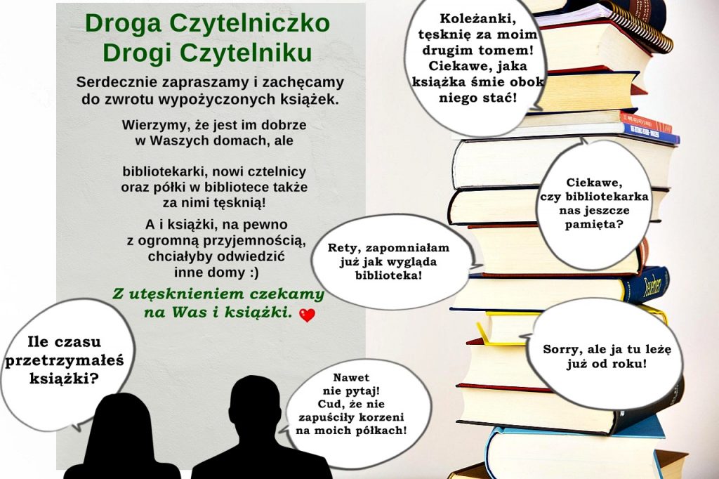 Drodzy Czytelnicy – w każdym wieku ???? Uwielbiamy, gdy wypożyczacie książki, czasem nawet w „hurcie”. Uwielbiamy, gdy dzielicie się wrażeniami czytelniczymi. Cieszy nas każdy człowiek wpadający po książkę. Ale wiemy też, jak to w życiu bywa… Przeczytamy, odłożymy z zamiarem, iż przy okazji zajrzymy do biblioteki i oddamy. A czas nieubłaganie i niezłośliwie, ale bezlitośnie, upływa w tygodnie, miesiące, a nawet… lata.